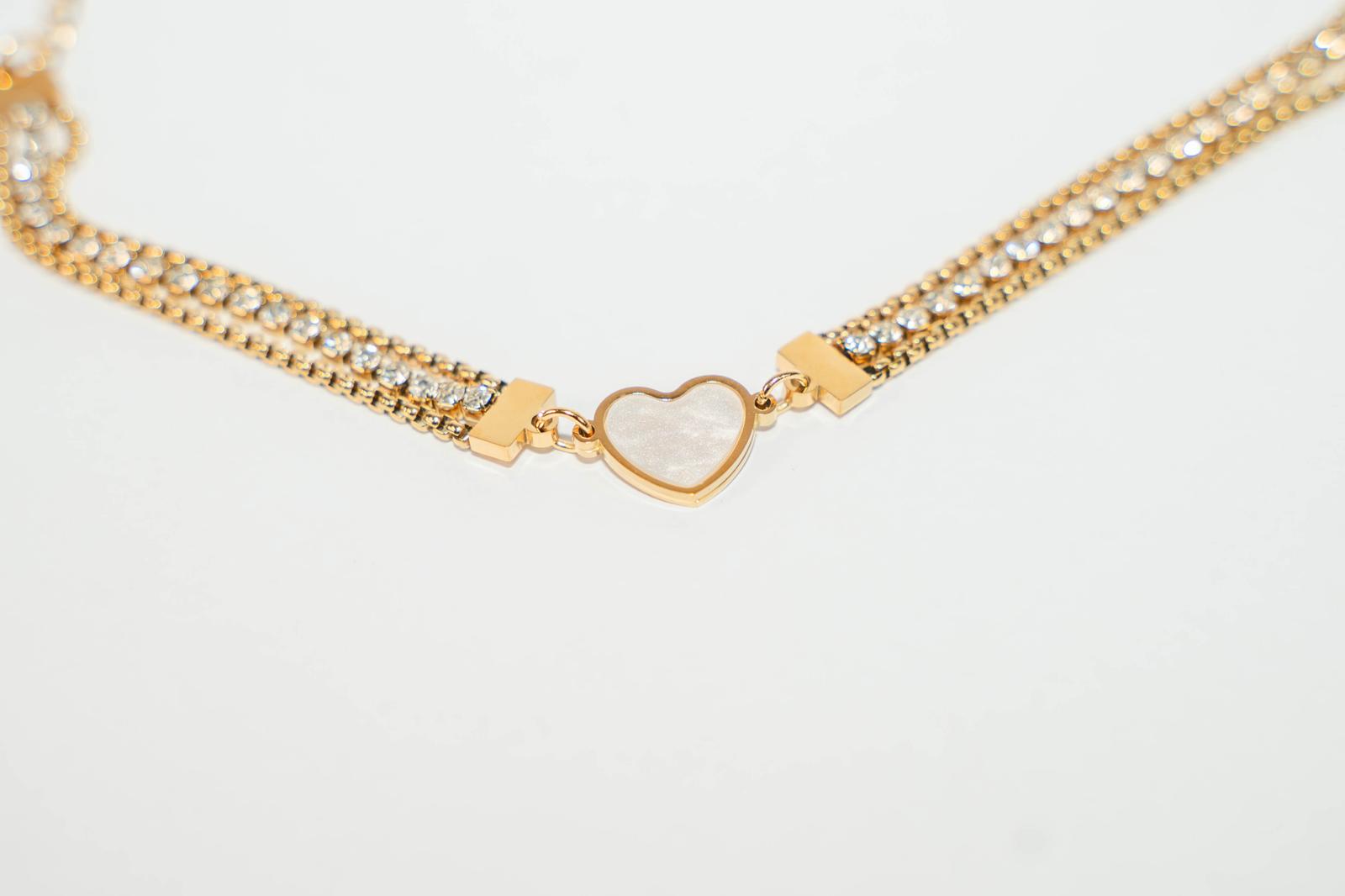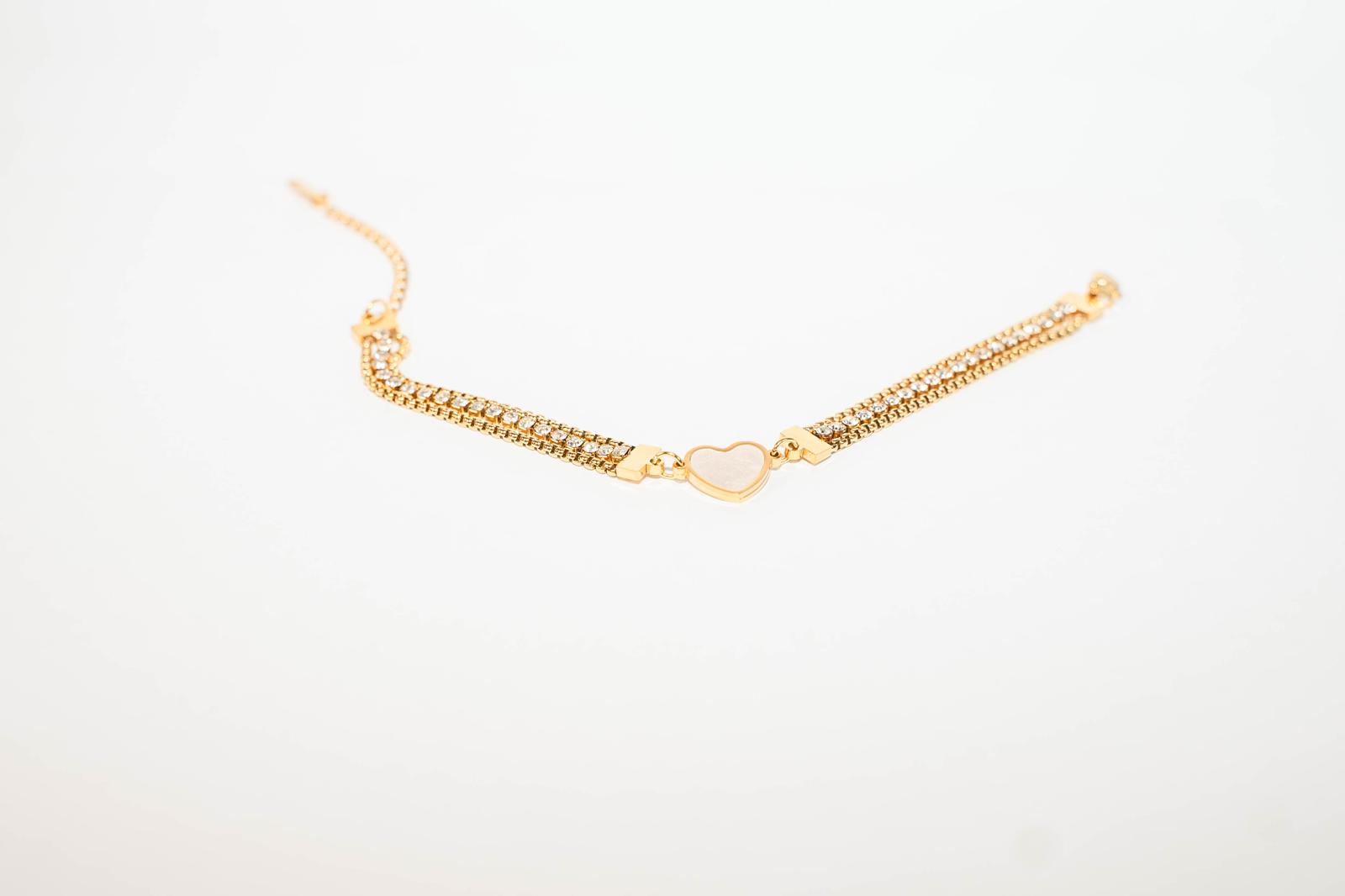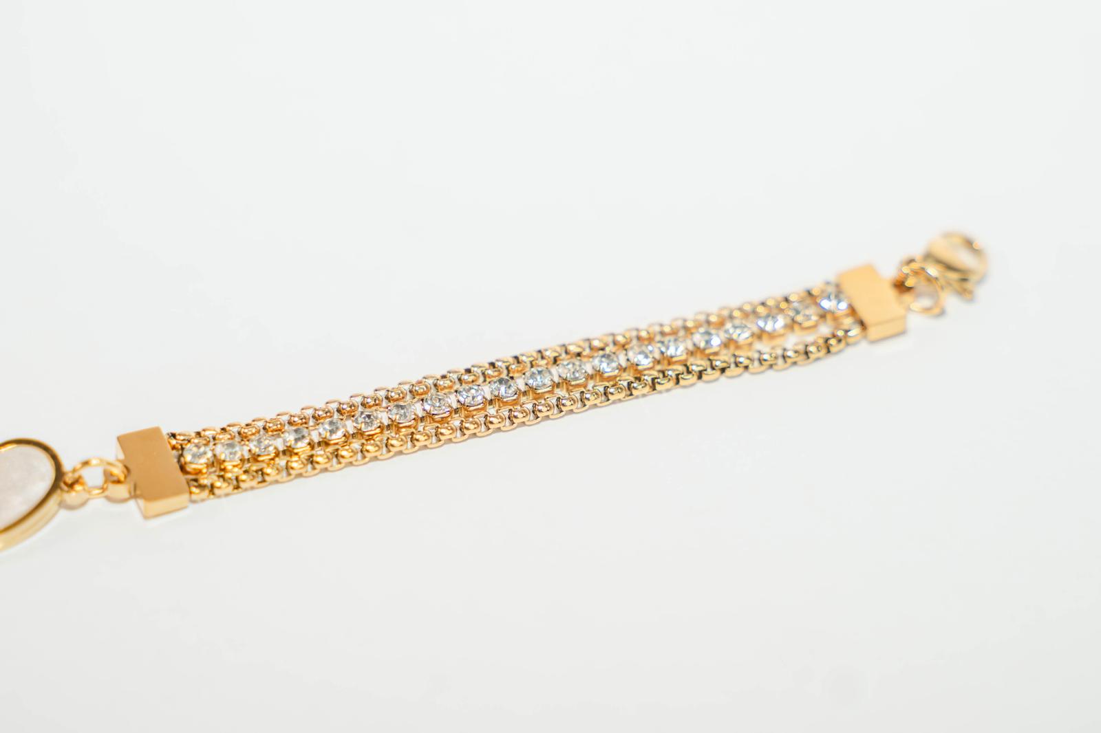 Son cœur central nacré est mis en valeur par deux chaînes ornées de cristaux scintillants qui captent la lumière à chaque mouvement. Idéal pour sublimer votre poignet avec élégance, que ce soit pour une occasion spéciale ou au quotidien.
